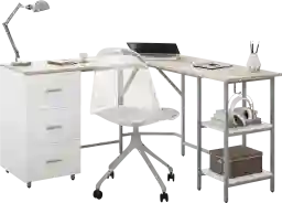 The Milldes L-shape computer desk will add a rustic, contemporary feel to your room while creating an efficient workspace environment. It unifies a heavy-duty steel frame with gold accents and appealing rich, engineered white color wood tabletop that offers enough space to meet your work needs while you focus on your projects. This stylish and functional L-shaped desk design includes two adjustable open shelves and three side white storage drawers to conceal office accessories and documents. The desk's functionality and versatility brings style and organizational appeal to your workspace. Customer assembly required.