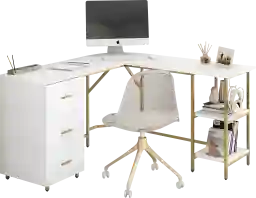 The Milldes L-shape computer desk will add a rustic, contemporary feel to your room while creating an efficient workspace environment. It unifies a heavy-duty steel frame with gold accents and appealing rich, engineered white color wood tabletop that offers enough space to meet your work needs while you focus on your projects. This stylish and functional L-shaped desk design includes two adjustable open shelves and three side white storage drawers to conceal office accessories and documents. The desk's functionality and versatility brings style and organizational appeal to your workspace. Customer assembly required.