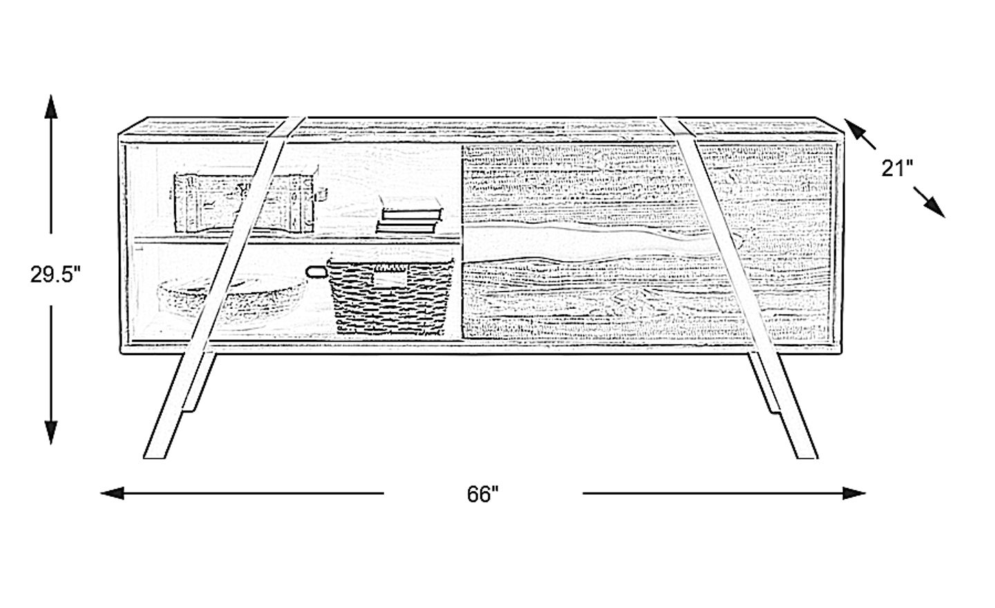 Combining live edge and industrial styling the Millwood console provides storage with an on-trend aesthetic. This 66 inch console has a smooth surface perfect for a flat screen TV. The area below, accessible by a sliding door, has a long shelf ideal for electronic components and other items. Pass through holes on the back panel keep wires out of view. Angled metal legs boast a black color that complements the rich brown finish. The console is made with pine solids and pine veneers.