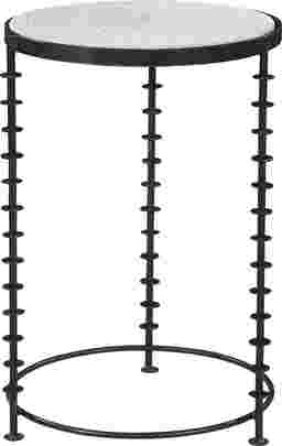 The Milne accent table is made of white marble top and a distressed iron base with ringlet decor in black industrial finish.