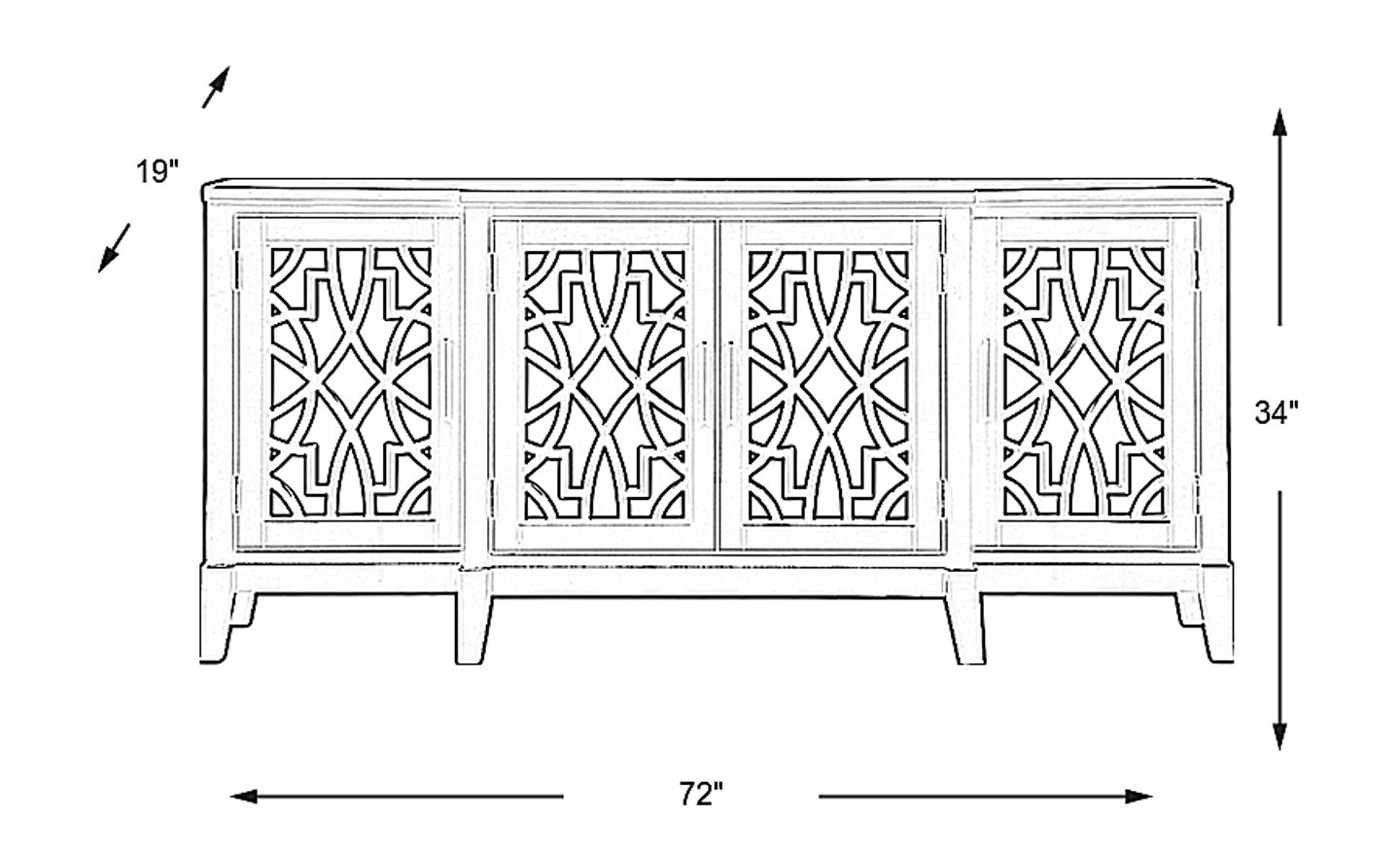 Clean simple lines are the perfect framework for the intricate raised overlay that fronts the four mirrored doors on the stylish Minetta II console. Finished in a decorator friendly ivory color, this piece is ideal for decorative storage. Behind the doors are three shelves for quick and easy access to puzzles, books, craft projects and more.