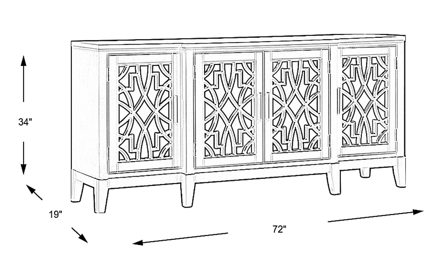 Clean simple lines are the perfect framework for the intricate raised overlay that fronts the four mirrored doors on the stylish Minetta II console. Finished in a stunning midnight color, this piece is ideal for decorative storage. Behind the doors are three shelves for quick and easy access to puzzles, books, craft projects and more.