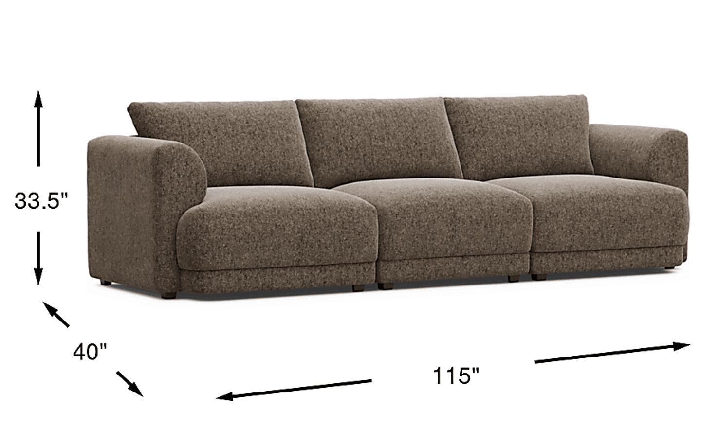 While this 3-piece configuration has a generous 115-inch width, its modular design makes it exceptionally well-suited for smaller or challenging spaces. Because it consists of three separate pieces—a left arm chair, an armless chair, and a right arm chair—it is much easier to maneuver through narrow hallways, doorways, and elevators than a standard oversized sofa. Additionally, the pieces can be separated to fit specific room dimensions.