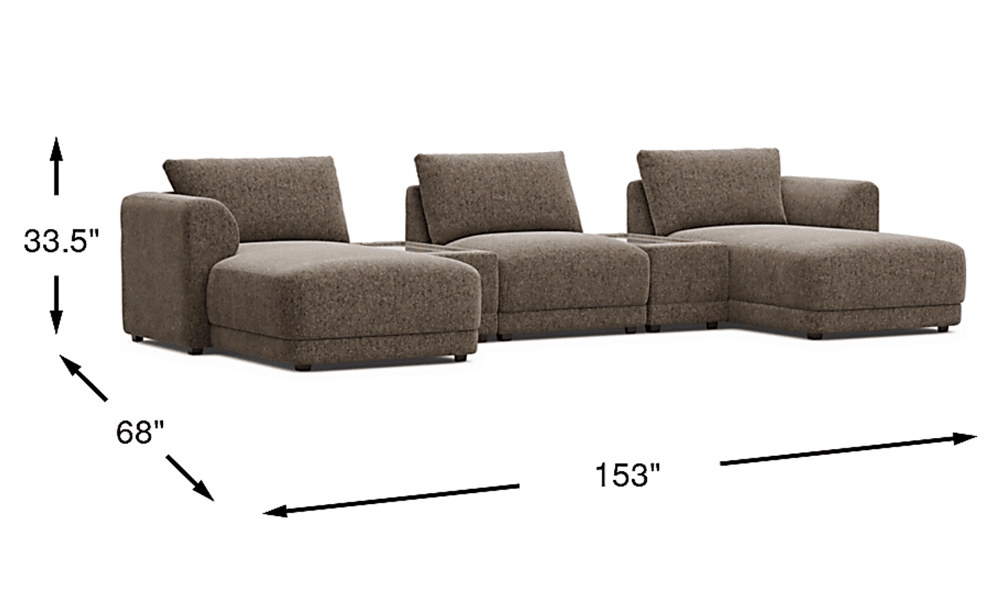 The story of your space is waiting to unfold, its memories, laughs, movie nights and great times, all with the Drew & Jonathan ModularFour living room as the setting you configure to bring it to life. This customizable contemporary seating solution features individual pieces that can be reconfigured endlessly to the shape you need. All-sides upholstery in mink brown chenille offers modern style and comfort at every angle while large, rounded wedge arms invite long sessions of indulgent relaxation. Effortlessly tailor your seating arrangement for everything from game days to sleepovers to everyday relaxation with easy-to-use connectors for rock solid stability. The included consoles feature integrated USB-A and USB-C charging for ultimate convenience. Includes left arm chaise, two consoles, armless chair and right arm chaise. Visit a showroom to learn more about individual components and to work with a sales specialist to customize your own configuration today. Upholstery: 100% Polyester.