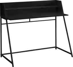 Look at your home office from a different angle with this Minkler computer desk featuring a storage hutch. Finished in a black laminate, the compact desktop has side panels that slant to seamlessly align with the attractive, trapezoid-shaped metal legs for a clean look. The hutch includes 1 long shelf that is the ideal size to hold small items like wireless speakers or a block of sticky notes. Supporting the desktop is a sturdy metal base in black with a support bar on back that runs parallel to the shelf. This contemporary laptop or writing table with a space-saving design is a great choice if you use your living room or bedroom as a home office. Customer assembly is required.