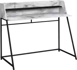 Look at your home office from a different angle with this Minkler computer desk featuring a storage hutch. Finished in a white marble-look laminate, the compact desktop has side panels that slant to seamlessly align with the attractive, trapezoid-shaped metal legs for a clean look. The hutch includes 1 long shelf in a contrasting black finish that is the ideal size to hold small items like wireless speakers or a block of sticky notes. Supporting the desktop is a sturdy metal base in black with a support bar on back that runs parallel to the shelf. This contemporary laptop or writing table with a space-saving design is a great choice if you use your living room or bedroom as a home office. Customer assembly is required.