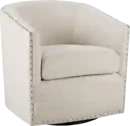 Relax in style with the Minturn swivel chair. The curved design and high-density foam cushion creates a deep and comfortable seat allowing for instant relaxation. Silver nail heads line the arms and back adding charm and style to the lounge chair. The swivel feature allows the lounge chair to rotate on its black metal base. Upholstered in a natural-colored fabric, this swivel chair fits in any room of your home. Customer assembly is required.