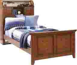 Offering classic style with useful updates for modern life, the Mission bookcase bed is a timeless addition to any child's bedroom. Crafted of wood solids and oak veneers with a rubbed finish, details such as walnut veneer inlays and slat detailing give this bed a quality feel. The functional bookcase headboard features a shelf, open cubby and two closed door cabinets featuring antique brass hardware, providing plenty of storage for books, toys and more. Mattress and foundation (if required) sold separately. Bed shown is twin size. Bunkie required for mattress support.