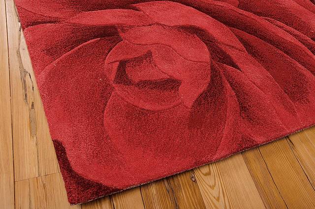Add a touch of elegance to your space with the glamorous Moda Rose rug. Featuring a floral design of bold red roses. Made of 80% wool and 20% luxcelle. Professional clean only.