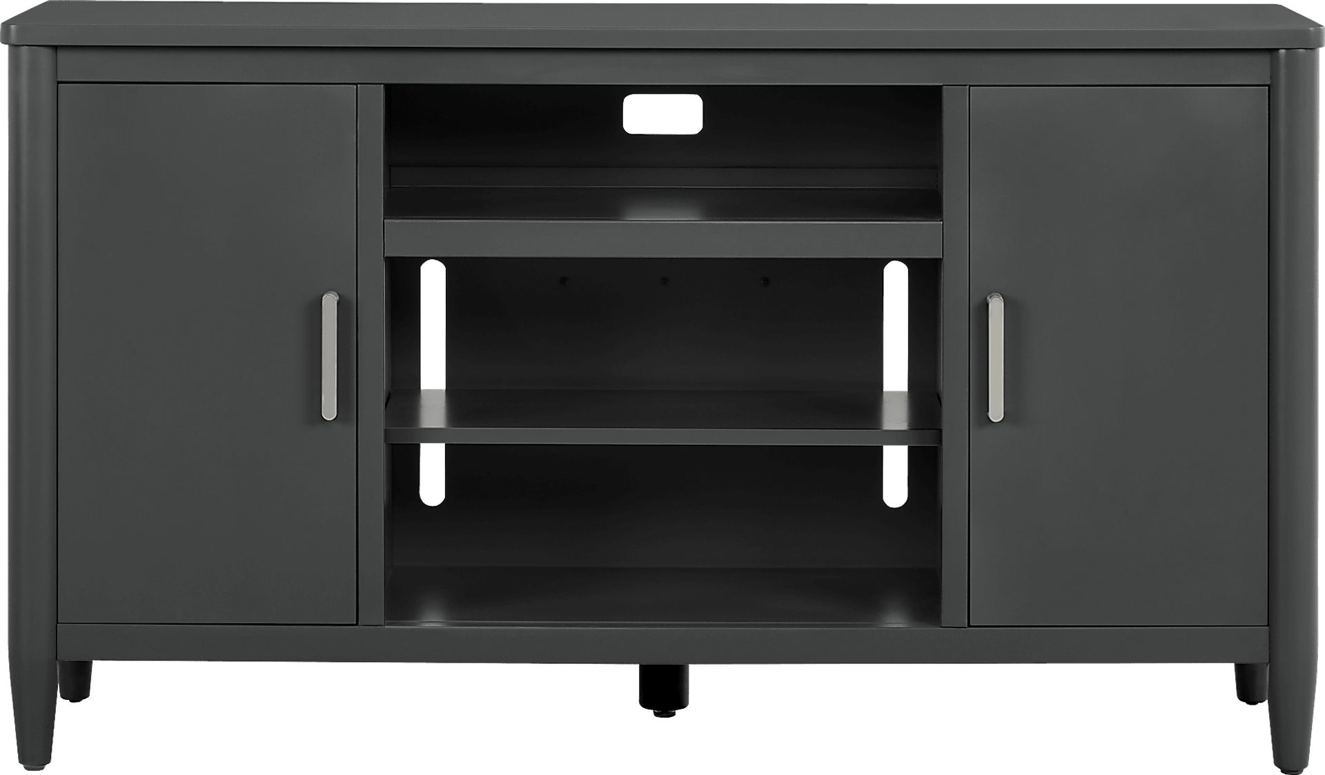 Contemporary flair meets timeless elegance with the Modern Villa collection, transforming your home into a sanctuary of style. This essential accent is tailored with an attractive design that's fresh and modern. Spacious to accommodate most televisions that measure up to 70 inches, the console features three center shelves and two doors. Wire-management holes on the back panel make it easy to keep cords from home entertainment hardware. Brushed nickel pulls and knobs pop alongside the iron ore finish while tapered spun legs give the look an irresistible final flourish.
