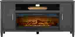 Contemporary flair meets timeless elegance with the Modern Villa collection, transforming your home into a sanctuary of style. Crafted from poplar wood solids, the console is tailored with an attractive design that's fresh and modern. Spacious to accommodate most televisions that measure up to 80 inches, the console features a center shelf and two doors. Wire-management holes on the back panel make it easy to keep cords from home entertainment hardware. Brushed nickel pulls and knobs pop alongside the iron ore finish while tapered spun legs give the look an irresistible final flourish. The electric fireplace features innovative flame effects on logs for added depth and 3D realism. A convenient remote control adjusts the flame and glow levels and includes a built-in timer (from 30 minutes to 60 hours). The adjustable thermostat ranges from 62 degrees to 82 degrees.
