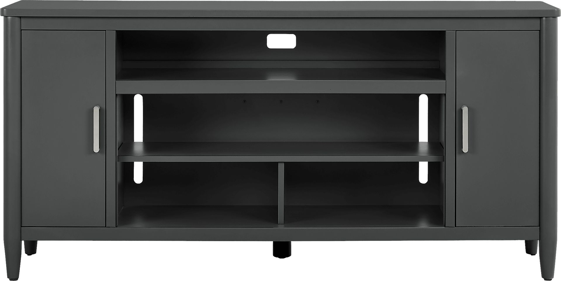 Contemporary flair meets timeless elegance with the Modern Villa collection, transforming your home into a sanctuary of style. This essential accent is tailored with an attractive design that's fresh and modern. Spacious to accommodate most televisions that measure up to 80 inches, the console features three center shelves and two doors. Wire-management holes on the back panel make it easy to keep cords from home entertainment hardware. Brushed nickel pulls and knobs pop alongside the iron ore finish while tapered spun legs give the look an irresistible final flourish.