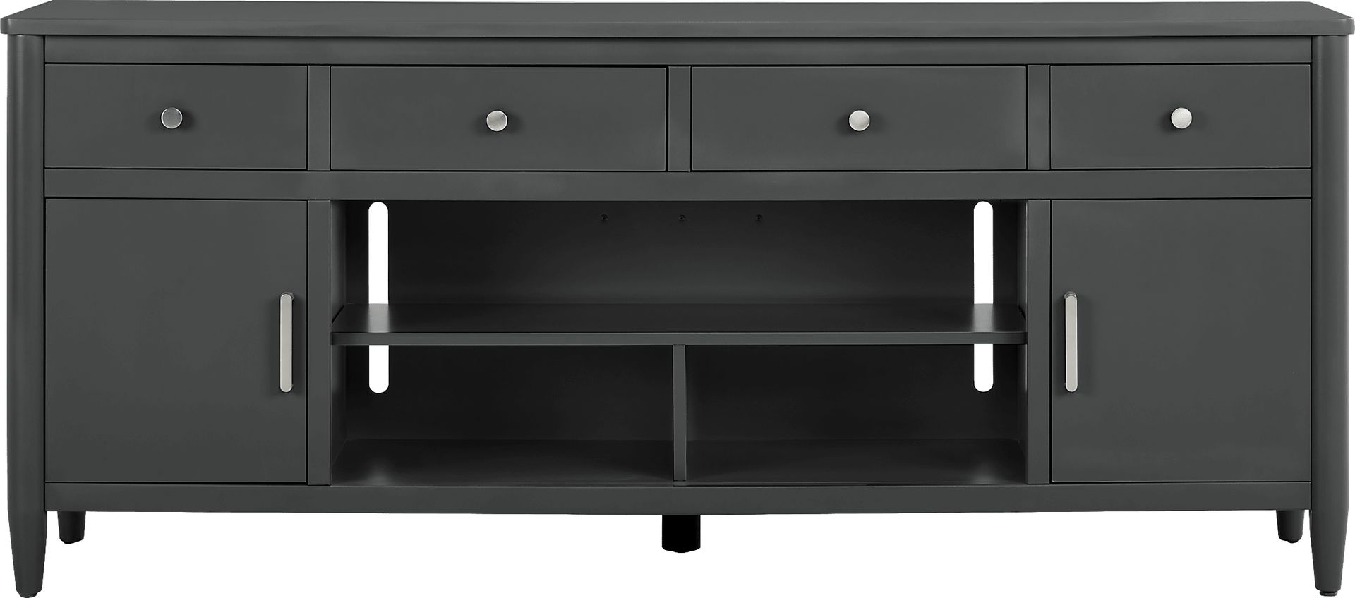 Contemporary flair meets timeless elegance with the Modern Villa collection, transforming your home into a sanctuary of style. This essential accent is tailored with an attractive design that's fresh and modern. Spacious to accommodate most televisions that measure up to 90 inches, the console features three center shelves, four drawers and two doors. Wire-management holes on the back panel make it easy to keep cords from home entertainment hardware. Brushed nickel pulls and knobs pop alongside the iron ore finish while tapered spun legs give the look an irresistible final flourish.