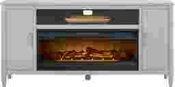 Contemporary flair meets timeless elegance with the Modern Villa collection, transforming your home into a sanctuary of style. Crafted from poplar wood solids, the console is tailored with an attractive design that's fresh and modern. Spacious to accommodate most televisions that measure up to 80 inches, the console features a center shelf and two doors. Wire-management holes on the back panel make it easy to keep cords from home entertainment hardware. Brushed nickel pulls and knobs pop alongside the light gray finish while tapered spun legs give the look an irresistible final flourish. The electric fireplace features innovative flame effects on logs for added depth and 3D realism. A convenient remote control adjusts the flame and glow levels and includes a built-in timer (from 30 minutes to 60 hours). The adjustable thermostat ranges from 62 degrees to 82 degrees.