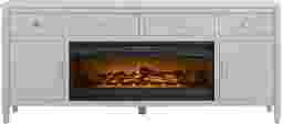 Contemporary flair meets timeless elegance with the Modern Villa collection, transforming your home into a sanctuary of style. Crafted from poplar wood solids, the console is tailored with an attractive design that's fresh and modern. Spacious to accommodate most televisions that measure up to 90 inches, the console features three center shelves, four drawers and two doors. Wire-management holes on the back panel make it easy to keep cords from home entertainment hardware. Brushed nickel pulls and knobs pop alongside the light gray finish while tapered spun legs give the look an irresistible flourish. The electric fireplace features innovative flame effects on logs for added depth and 3D realism. A convenient remote control adjusts the flame and glow levels and includes a built-in timer (from 30 minutes to 60 hours). The adjustable thermostat ranges from 62 degrees to 82 degrees.