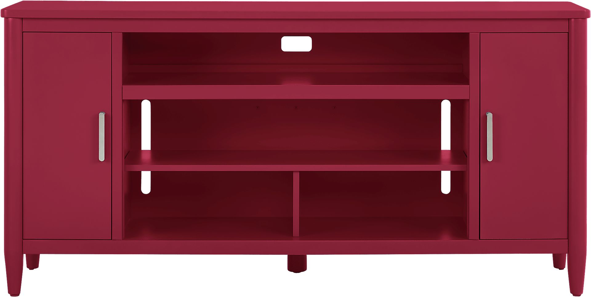 Contemporary flair meets timeless elegance with the Modern Villa collection, transforming your home into a sanctuary of style. This essential accent is tailored with an attractive design that's fresh and modern. Spacious to accommodate most televisions that measure up to 80 inches, the console features three center shelves and two doors. Wire-management holes on the back panel make it easy to keep cords from home entertainment hardware. Brushed nickel pulls and knobs pop alongside the red finish while tapered spun legs give the look an irresistible final flourish.