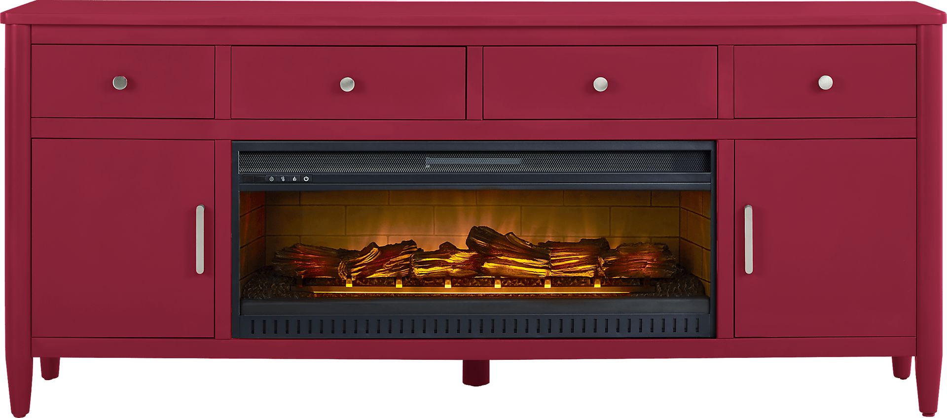 Contemporary flair meets timeless elegance with the Modern Villa collection, transforming your home into a sanctuary of style. This essential accent is tailored with an attractive design that's fresh and modern. Spacious to accommodate most televisions that measure up to 90 inches, the console features three center shelves, four drawers and two doors. Wire-management holes on the back panel make it easy to keep cords from home entertainment hardware. Brushed nickel pulls and knobs pop alongside the red finish while tapered spun legs give the look an irresistible flourish. The electric fireplace features innovative flame effects on logs for added depth and 3D realism. A convenient remote control adjusts the flame and glow levels and includes a built-in timer (from 30 minutes to 60 hours). The adjustable thermostat ranges from 62 degrees to 82 degrees.