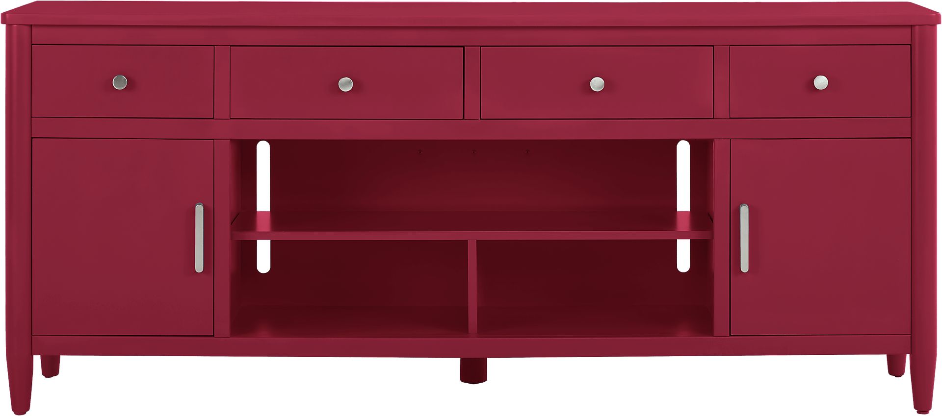Contemporary flair meets timeless elegance with the Modern Villa collection, transforming your home into a sanctuary of style. This essential accent is tailored with an attractive design that's fresh and modern. Spacious to accommodate most televisions that measure up to 90 inches, the console features three center shelves, four drawers and two doors. Wire-management holes on the back panel make it easy to keep cords from home entertainment hardware. Brushed nickel pulls and knobs pop alongside the red finish while tapered spun legs give the look an irresistible final flourish.