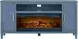 Contemporary flair meets timeless elegance with the Modern Villa collection, transforming your home into a sanctuary of style. Crafted from poplar wood solids, the console is tailored with an attractive design that's fresh and modern. Spacious to accommodate most televisions that measure up to 80 inches, the console features a center shelf and two doors. Wire-management holes on the back panel make it easy to keep cords from home entertainment hardware. Brushed nickel pulls and knobs pop alongside the slate blue finish while tapered spun legs give the look an irresistible final flourish. The electric fireplace features innovative flame effects on bricks and logs for added depth and 3D realism. A convenient remote control adjusts the flame and glow levels and includes a built-in timer (from 30 minutes to 60 hours). The adjustable thermostat ranges from 62 degrees to 82 degrees.