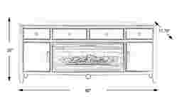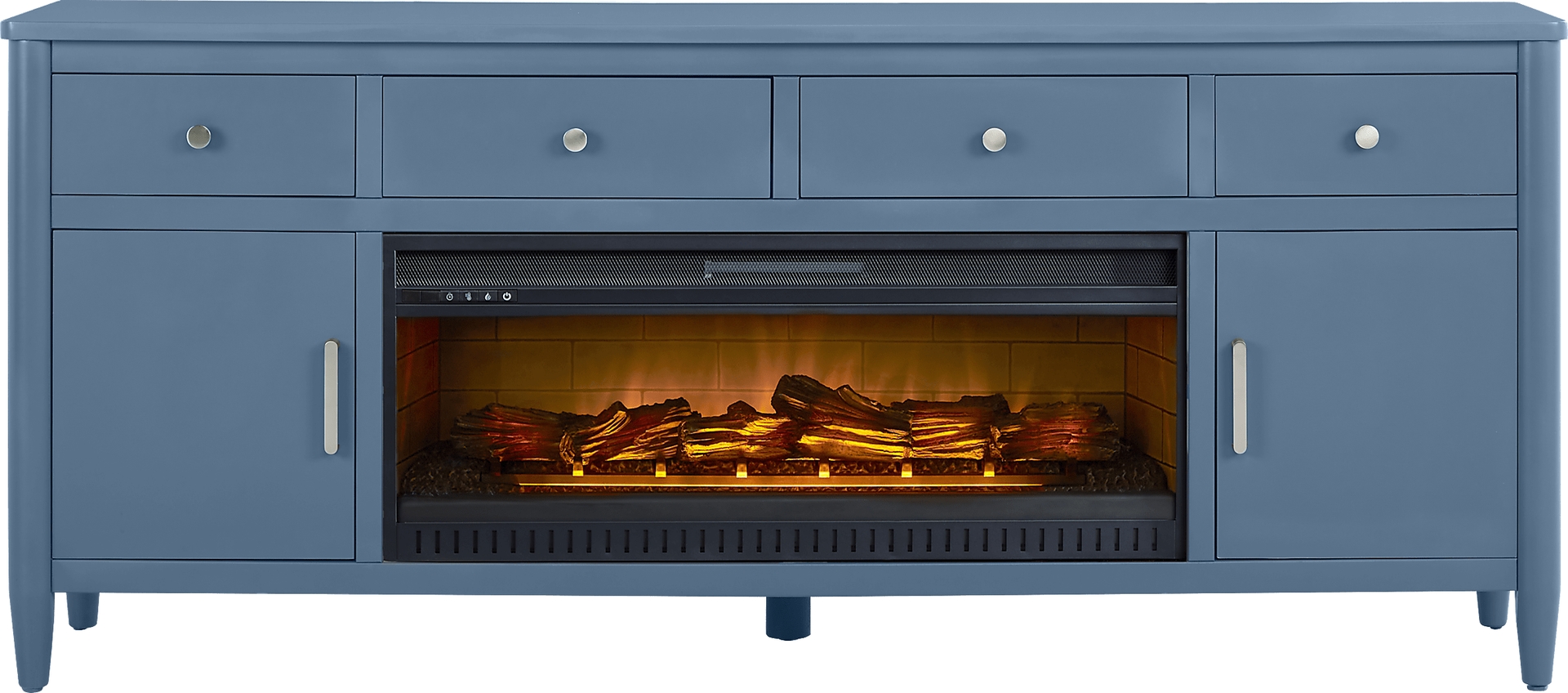 Contemporary flair meets timeless elegance with the Modern Villa collection, transforming your home into a sanctuary of style. Crafted from poplar wood solids, the console is tailored with an attractive design that's fresh and modern. Spacious to accommodate most televisions that measure up to 90 inches, the console features three center shelves, four drawers and two doors. Wire-management holes on the back panel make it easy to keep cords from home entertainment hardware. Brushed nickel pulls and knobs pop alongside the slate blue finish while tapered spun legs give the look an irresistible flourish. The electric fireplace features innovative flame effects on logs for added depth and 3D realism. A convenient remote control adjusts the flame and glow levels and includes a built-in timer (from 30 minutes to 60 hours). The adjustable thermostat ranges from 62 degrees to 82 degrees.