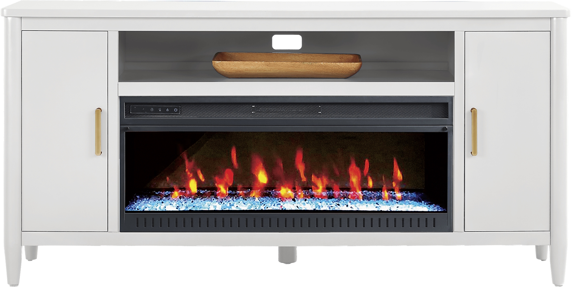 Contemporary flair meets timeless elegance with the Modern Villa collection, transforming your home into a sanctuary of style. Crafted from poplar wood solids, the console is tailored with an attractive design that's fresh and modern. Spacious to accommodate most televisions that measure up to 80 inches, the console features a center shelf and two doors. Wire-management holes on the back panel make it easy to keep cords from home entertainment hardware. Brushed nickel pulls and knobs pop alongside the white finish while tapered spun legs give the look an irresistible final flourish. The removable fireplace portion features a realistic energy-saving LED firebox with remote controlled heat and ambient lighting with four color changing options. LED color effects can be used with or without heat.