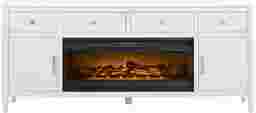 Contemporary flair meets timeless elegance with the Modern Villa collection, transforming your home into a sanctuary of style. Crafted from poplar wood solids, the console is tailored with an attractive design that's fresh and modern. Spacious to accommodate most televisions that measure up to 90 inches, the console features three center shelves, four drawers and two doors. Wire-management holes on the back panel make it easy to keep cords from home entertainment hardware. Brushed nickel pulls and knobs pop alongside the white finish while tapered spun legs give the look an irresistible flourish. The electric fireplace features innovative flame effects on logs for added depth and 3D realism. A convenient remote control adjusts the flame and glow levels and includes a built-in timer (from 30 minutes to 60 hours). The adjustable thermostat ranges from 62 degrees to 82 degrees.
