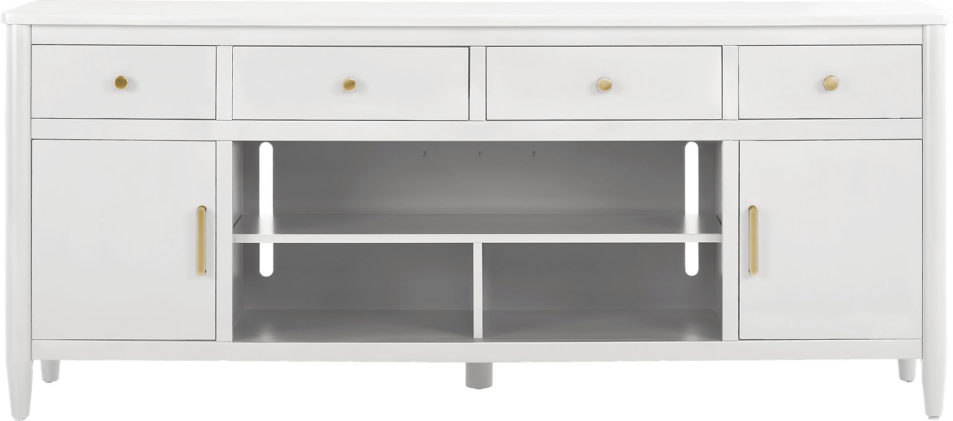 Contemporary flair meets timeless elegance with the Modern Villa collection, transforming your home into a sanctuary of style. This essential accent is tailored with an attractive design that's fresh and modern. Spacious to accommodate most televisions that measure up to 90 inches, the console features three center shelves, four drawers and two doors. Wire-management holes on the back panel make it easy to keep cords from home entertainment hardware. Brushed nickel pulls and knobs pop alongside the white finish while tapered spun legs give the look an irresistible final flourish.