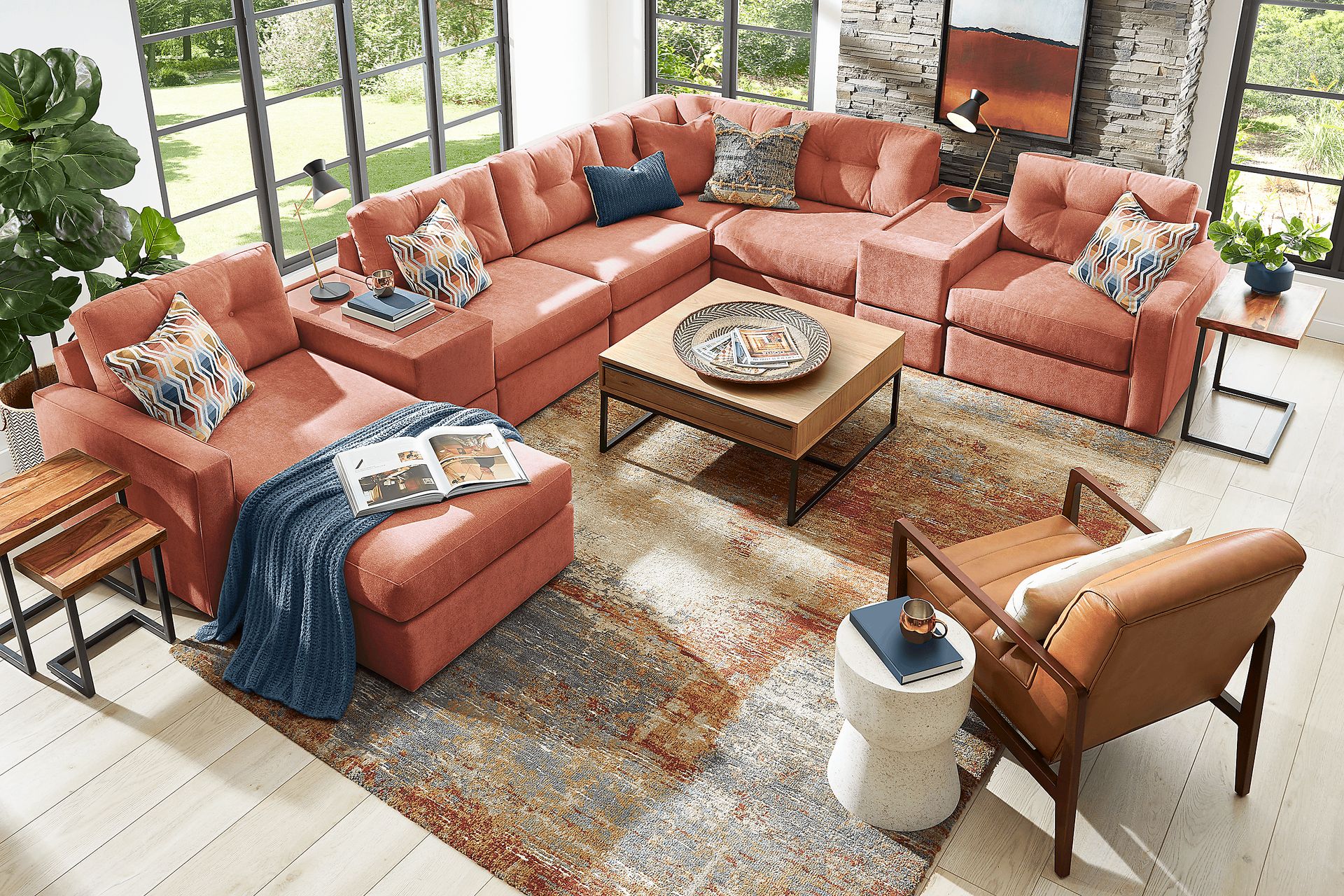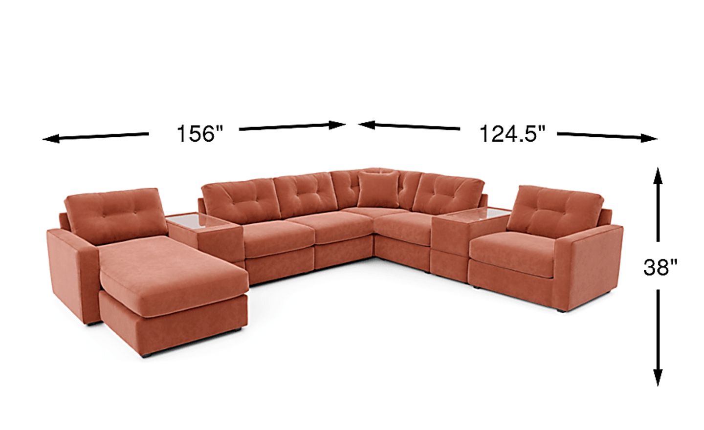 Discover the limitless possibilities of the Drew & Jonathan ModularOne sectional, thoughtfully designed with comfort and flexibility in mind. This customizable seating solution features individual pieces that can be reconfigured to the shape you need. Game days, movie nights, sleepovers, and everyday relaxation are all better when the seating arrangement you want is always right at your fingertips.Each individual piece is upholstered on all sides in our signature fabric, New Horizon. This soft, copper chenille includes Repreve yarn, made with recycled plastic bottles. The open seating includes a chaise and has welted track arms, top-stitched seat cushions and button-tufted back cushions for an elegant silhouette. Two center consoles provide hidden storage and double as side tables with an acrylic top. A matching pillow provides the perfect final touch. Includes RAF chaise, two consoles, three armless chairs, corner wedge, & LAF chair. Visit a showroom to learn more about individual components and to work with a sales specialist to customize your own configuration today.