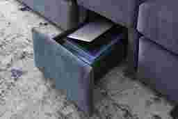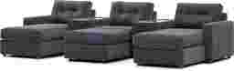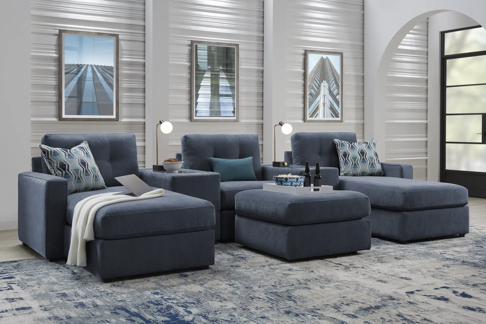 Discover the limitless possibilities of the Drew & Jonathan ModularOne, thoughtfully designed with comfort and flexibility in mind. This customizable seating solution features individual pieces that can be reconfigured to the shape you need. Game days, movie nights, sleepovers, and everyday relaxation are all better when the seating arrangement you want is always right at your fingertips. Each individual piece is upholstered on all sides in our signature fabric, New Horizon. This soft, indigo chenille includes Repreve yarn, made with recycled plastic bottles. Featuring two chaises, an armless chair, and an ottoman, the upholstery in this collection boasts welted track arms, top-stitched seat cushions and button-tufted back cushions for an elegant silhouette. Two media consoles provide hidden storage, USB charging ports, wireless charging, bluetooth-enabled speakers, and double as side tables with sleek acrylic tops. Includes LAF chaise, two consoles, armless chair, ottoman, and RAF chaise. Visit a showroom to learn more about individual components and to work with a sales specialist to customize your own configuration today.