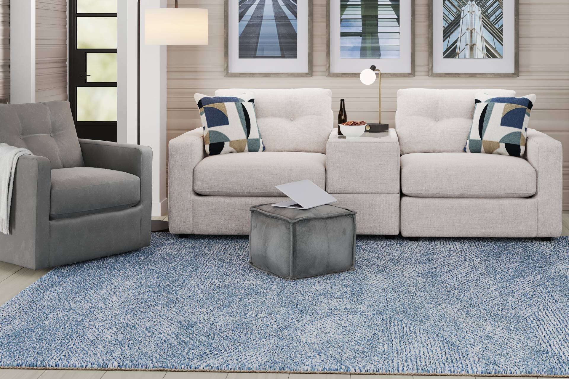 Discover the limitless possibilities of the Drew & Jonathan ModularOne, thoughtfully designed with comfort and flexibility in mind. This customizable seating solution features individual pieces that can be configured to any shape your room needs. Game days, movie nights, sleepovers, and everyday relaxation are all better when the seating arrangement you want is always right at your fingertips. Each individual piece is upholstered on all sides in our signature fabric, Miller. This textured, oyster colored fabric includes Repreve yarn, made with recycled plastic bottles. The dual seating area has welted track arms, top-stitched seat cushions and button-tufted back cushions for an elegant silhouette. A center console provides hidden storage and doubles as a side table with a sleek acrylic top. A matching pillow provides the perfect final touch. Includes LAF chair, console and RAF chair. Visit a showroom to learn more about individual components and to work with a sales specialist to customize your own configuration today.