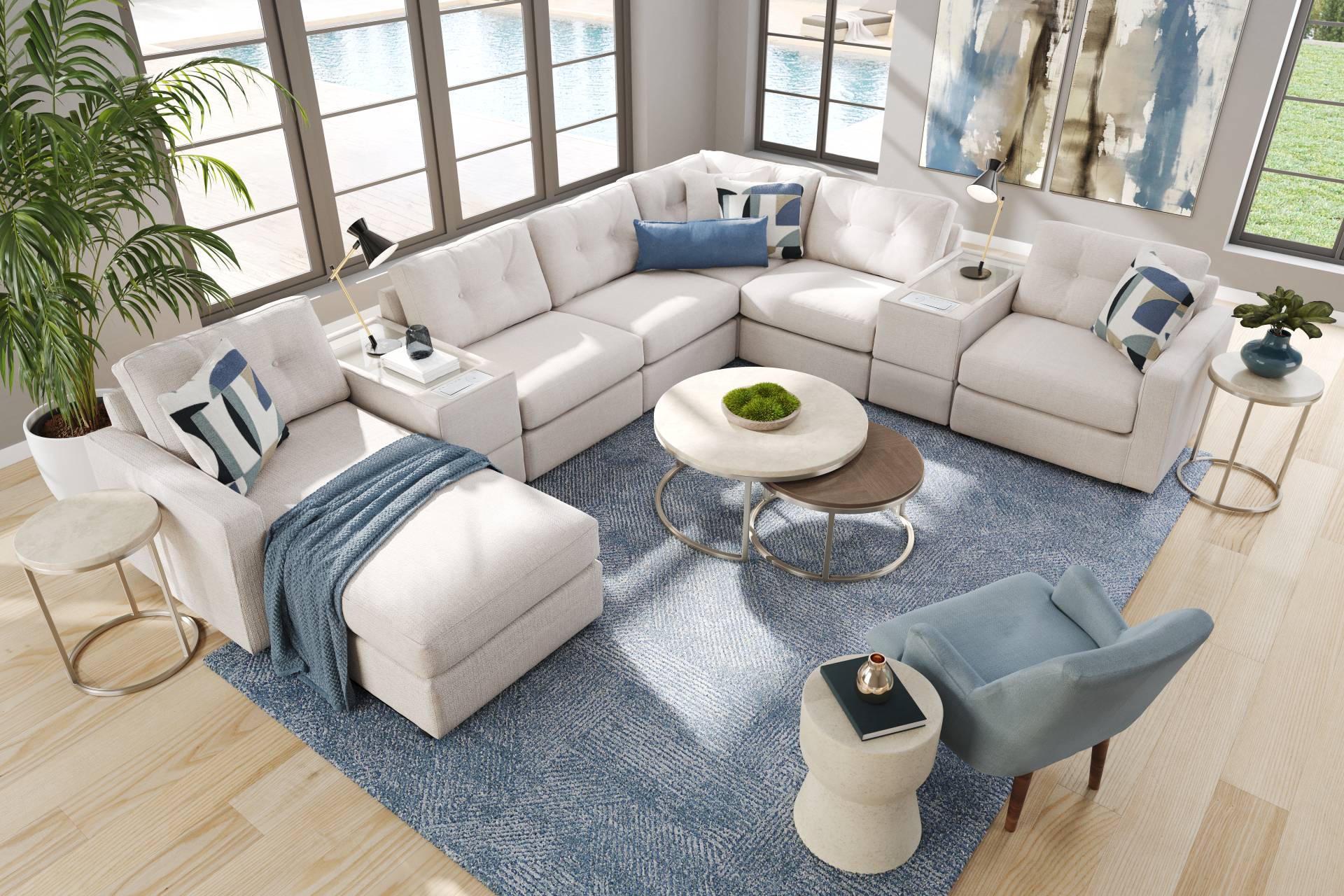 Discover the limitless possibilities of the Drew & Jonathan ModularOne, thoughtfully designed with comfort and flexibility in mind. This customizable seating solution features individual pieces that can be reconfigured to the shape you need. Game days, movie nights, sleepovers, and everyday relaxation are all better when the seating arrangement you want is always right at your fingertips. Each individual piece is upholstered on all sides in our signature fabric, Miller. This textured, oyster colored fabric includes Repreve yarn, made with recycled plastic bottles. The open seating includes a chaise and has welted track arms, top-stitched seat cushions and button-tufted back cushions for an elegant silhouette. Two media consoles provide hidden storage, USB charging ports, wireless charging, bluetooth-enabled speakers, and double as side tables with sleek acrylic tops. A matching pillow provides the perfect final touch. Includes LAF chaise, two consoles, three armless chairs, corner wedge and RAF chair. Visit a showroom to learn more about individual components and to work with a sales specialist to customize your own configuration today.