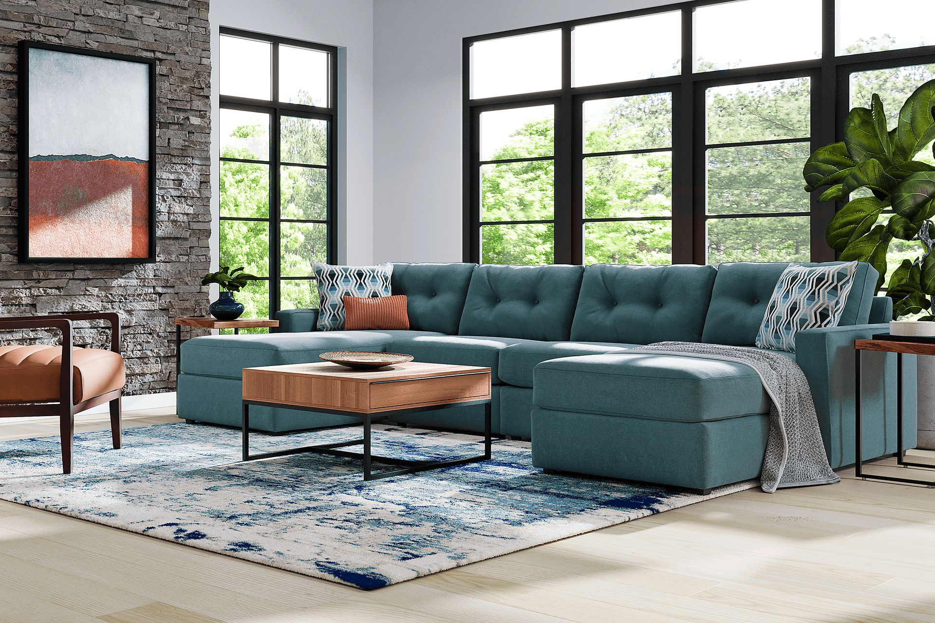 Discover the limitless possibilities of the Drew & Jonathan ModularOne sectional, thoughtfully designed with comfort and flexibility in mind. This customizable seating solution features individual pieces that can be configured to any shape your room needs. Game days, movie nights, sleepovers, and everyday relaxation are all better when the seating arrangement you want is always right at your fingertips. Each individual piece is upholstered on all sides in our signature fabric, New Horizon. This soft, teal chenille includes Repreve yarn, made with recycled plastic bottles. The seating area has welted track arms, top-stitched seat cushions and button-tufted back cushions for an elegant silhouette. Includes LAF chaise, two armless chairs, & RAF chaise. Visit a showroom to learn more about individual components and to work with a sales specialist to customize your own configuration today.
