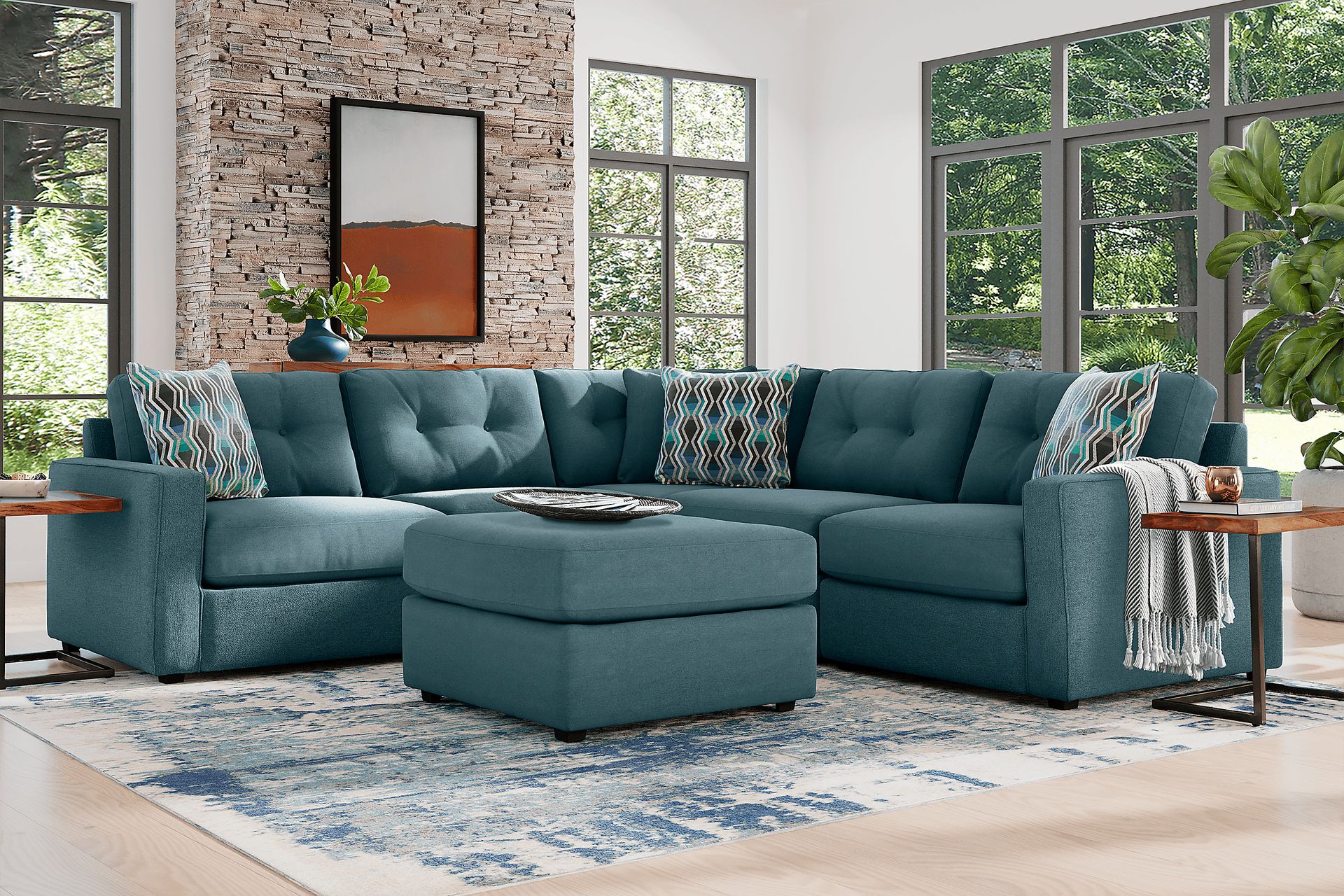 Discover the limitless possibilities of the Drew & Jonathan ModularOne sectional, thoughtfully designed with comfort and flexibility in mind. This customizable seating solution features individual pieces that can be reconfigured to the shape you need. Game days, movie nights, sleepovers, and everyday relaxation are all better when the seating arrangement you want is always right at your fingertips. Each individual piece is upholstered on all sides in our signature fabric, New Horizon. This soft, teal chenille includes Repreve yarn, made with post-consumer recycled water bottles. The open seating area has welted track arms, top-stitched seat cushions and button-tufted back cushions for an elegant silhouette. A matching pillow provides the perfect final touch. Includes LAF chair, two armless chairs, corner wedge, & RAF chair. Visit a showroom to learn more about individual components and to work with a sales specialist to customize your own configuration today.