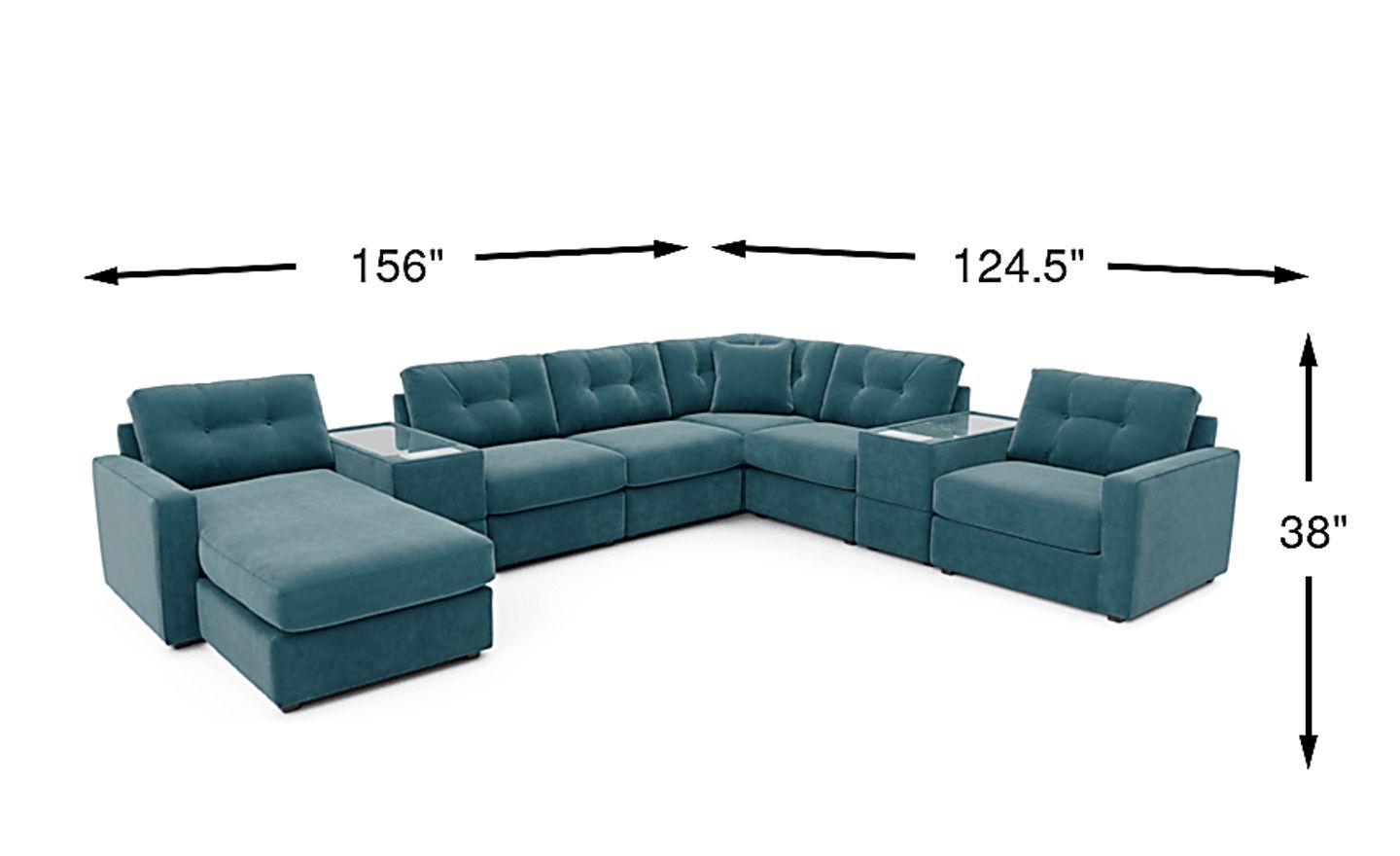 Discover the limitless possibilities of the Drew & Jonathan ModularOne sectional, thoughtfully designed with comfort and flexibility in mind. This customizable seating solution features individual pieces that can be reconfigured to the shape you need. Game days, movie nights, sleepovers, and everyday relaxation are all better when the seating arrangement you want is always right at your fingertips. Each individual piece is upholstered on all sides in our signature fabric, New Horizon. This soft, teal chenille includes Repreve yarn, made with recycled plastic bottles. The open seating includes a chaise and has welted track arms, top-stitched seat cushions and button-tufted back cushions for an elegant silhouette. Two media consoles provide hidden storage, USB charging ports, wireless charging, Bluetooth speakers, and double as side tables with sleek acrylic tops. A matching pillow provides the perfect final touch. Includes LAF chaise, two consoles, three armless chairs, corner wedge, and RAF chair. Visit a showroom to learn more about individual components and to work with a sales specialist to customize your own configuration today.