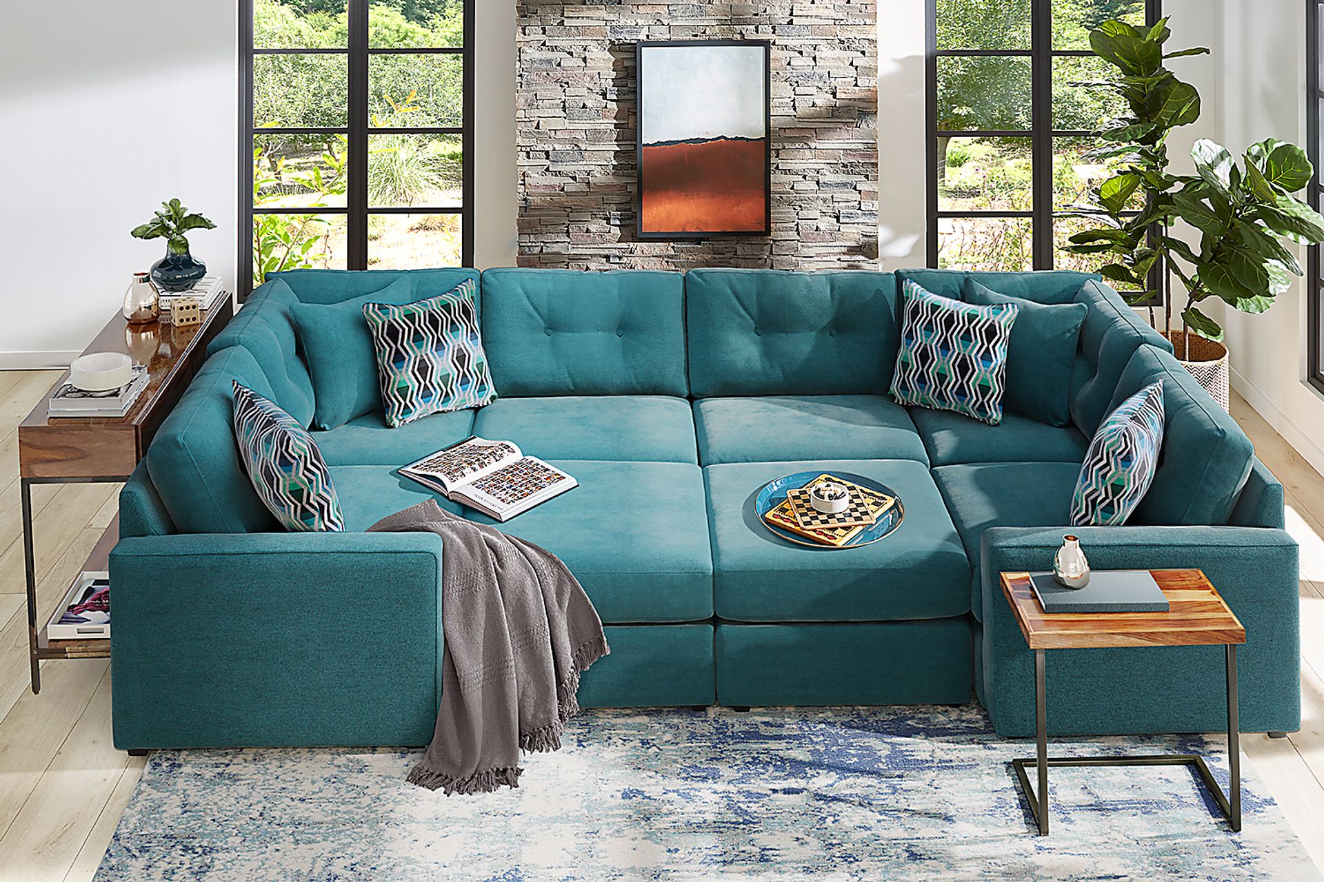 Discover the limitless possibilities of the Drew & Jonathan ModularOne sectional, thoughtfully designed with comfort and flexibility in mind. This customizable seating solution features individual pieces that can be reconfigured to the shape you need. Game days, movie nights, sleepovers, and everyday relaxation are all better when the seating arrangement you want is always right at your fingertips. Each individual piece is upholstered on all sides in our signature fabric, New Horizon. This soft, teal chenille includes Repreve yarn, made with recycled plastic bottles. The seating area has welted track arms, top-stitched seat cushions and button-tufted back cushions for an elegant silhouette. Two ottomans on casters slide into the middle and lock in place to create a cozy area the whole family can enjoy. A matching pillow provides the perfect final touch. Includes LAF chair, two corner wedges, 2 armless chairs, 2 ottomans, & RAF chair. Visit a showroom to learn more about individual components and to work with a sales specialist to customize your own configuration today.