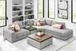 Discover the unlimited possibilities of the Drew & Jonathan ModularThree collection, thoughtfully designed to deliver the utmost in comfort and flexibility. Contemporary in style and upholstered in rich gray chenille, the tailored look of this innovative seating solution is accentuated by deep lounge seats offering the indulgent luxury of ultra-comfortable custom feather, fiber and down blend cushions. Each piece is upholstered on all sides, creating endless opportunities for reconfiguration and individual use. The extra-large console features a reading light, retracting USB hub and a bluetooth-enabled speaker magnetically mounted to a wireless charger. Under the console's sliding wood-top table is maximum space for storage of even the bulkiest relaxation essentials. Select a preconfigured design or visit a showroom to learn about individual components and create the modular solution perfect for your space and style. Includes LAF chair, 1 media console, 1 wedge and 1 RAF chaise. Upholstery: 100% Polyester.