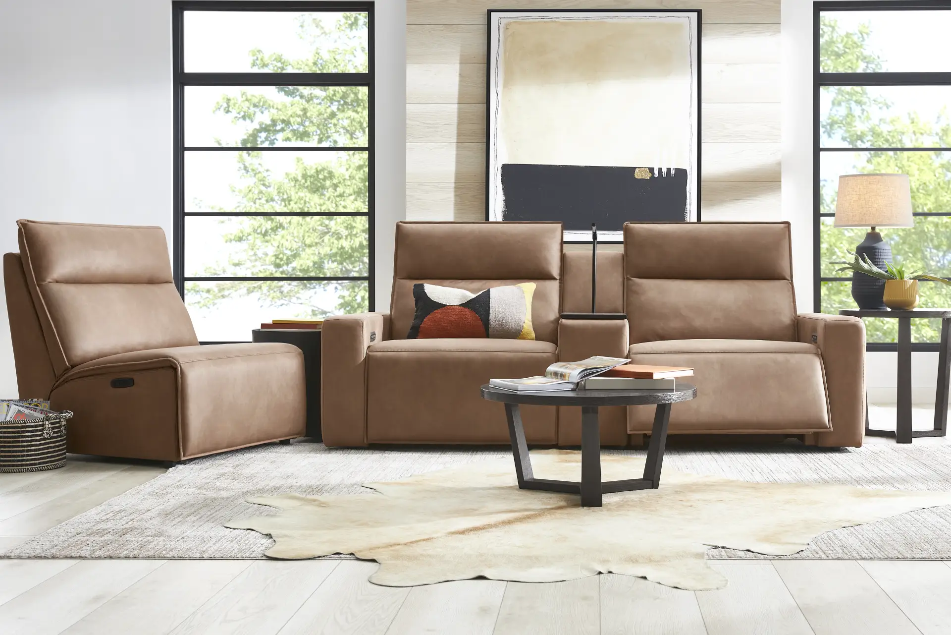 Discover the unlimited possibilities of the dual power reclining ModularTwo, thoughtfully designed with both comfort and flexibility in mind. Contemporary in style and upholstered in a plush suede-soft saddle colored microfiber, its tailored silhouette is enhanced by welted track arms and tufted back cushions for a look of refined elegance and serenity. Each piece is upholstered on all sides, offering endless opportunities for both reconfiguration as well as individual use. Dual power reclining functionality allows for easy adjustment in the headrest and footrest, providing the ultimate in personalized comfort. The center console includes a touch-activated reading light and swivel-top wood table with hidden storage for easy access to your lounging essentials. Select a preconfigured design or visit a showroom to learn about individual components and create the modular solution perfect for your space and style. Upholstery: 100% Polyester
