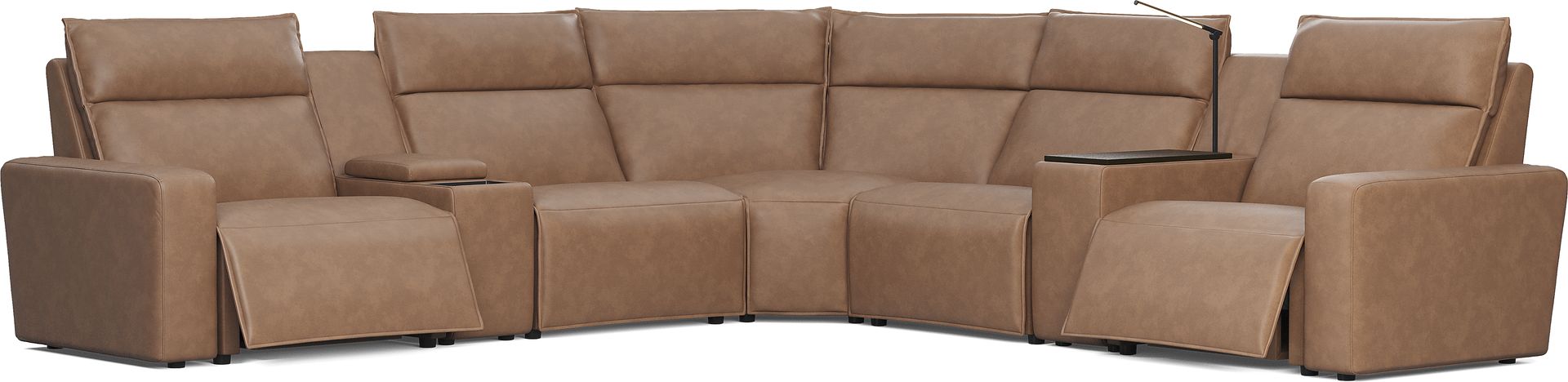 Discover the unlimited possibilities of the ModularTwo dual power reclining sectional, thoughtfully designed with both comfort and flexibility in mind. Contemporary in style and upholstered in a plush suede-soft saddle colored microfiber, the sectional's tailored silhouette is enhanced by welted track arms and tufted back cushions for a look of refined elegance and serenity. Each piece is upholstered on all sides, offering endless opportunities for both reconfiguration as well as individual use. Dual power reclining functionality allows for easy adjustment in the headrest and footrest, providing the ultimate in personalized comfort. One console includes a touch-activated reading light and swivel-top wood table with hidden storage. The other features Bluetooth speaker connectivity, retracting cupholders and wireless charging. Select a preconfigured design or visit a showroom to learn about individual components and create the modular sectional perfect for your space and style. < Upholstery: 100% Polyester. Includes: Dual Power Right Arm Recliner and Left Arm Recliner, Dual Power Armless Recliner, Media Console and Wood Top Console, Armless Seat and Wedge Seat.