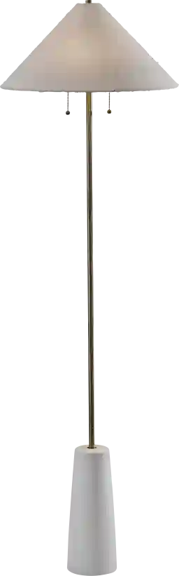 Introducing the Molena Shores White Floor Lamp, a stylish fusion of modern elegance and timeless design. This lamp features a sleek white ceramic base complemented by an antique brass metal pole for a touch of vintage charm. The white boucle fabric shade adds texture and softness, casting a warm and inviting glow in any space. Standing tall at 60 inches, this floor lamp is perfect for brightening up living rooms, bedrooms, or offices. Equipped with on/off double pull chain switches, this lamp combines practicality with an eye-catching aesthetic. Partial assembly may be required.