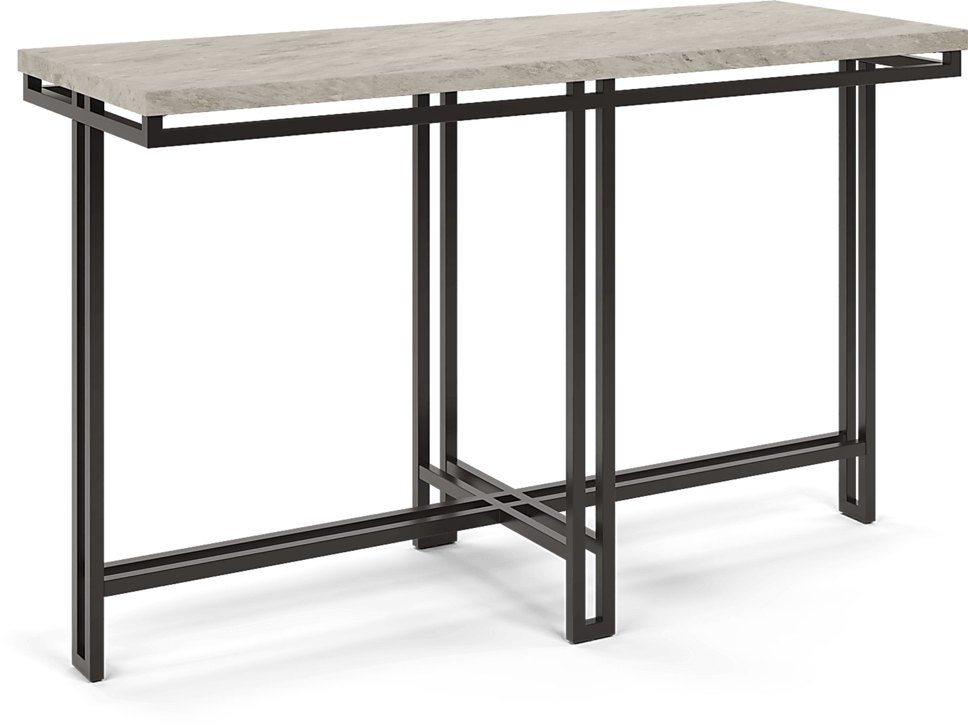 The Molino sofa table grants an upscale look to enhance any room. Boasting marble-inspired opulence, the beige stone tabletop offers a chic spot to place books, drinks and appetizers. Its long, narrow shape makes it a perfect piece to pair behind your sofa. Rendered in a dark gray finish, this table's metal legs form a geometric, artistic appearance. Some customer assembly.