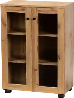 With a minimalist yet bold design, the Mollar storage cabinet organizes your space in contemporary style. This cabinet is constructed from oak brown finished wood that adds visual warmth to the current interior of your home. Three spacious shelves behind the glass doors create a convenient display to organize decorations and declutter busy rooms, equipped with two black finished metal door knobs that add a modern touch to the rustic aesthetic of the cabinet. A handy addition for any kitchen, living room, or hallway, this storage cabinet is a versatile upgrade to the modern home. Customer assembly is required.