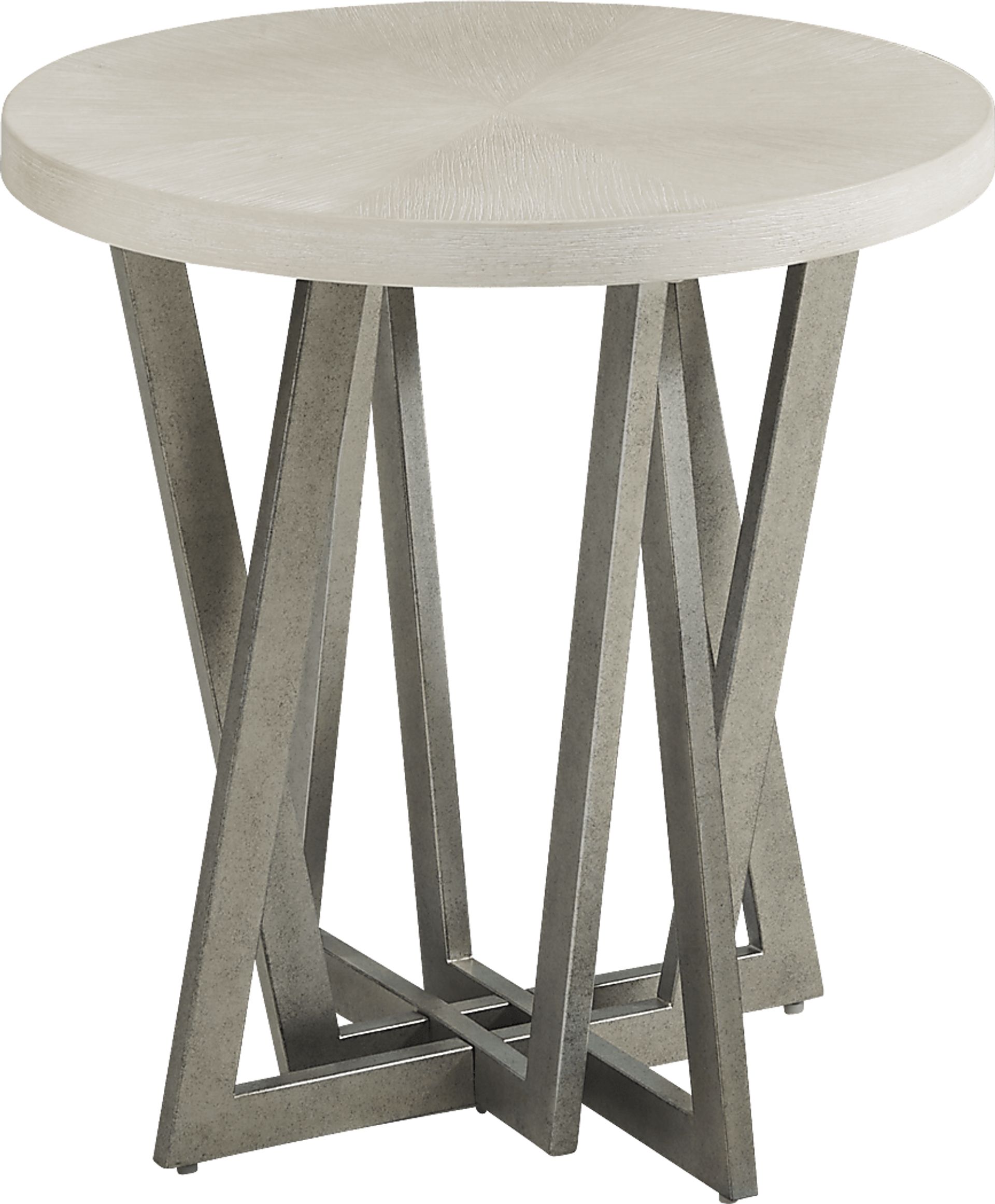 The Mona Vale end table showcases contemporary style at its finest. Made with cherry veneers, the tabletop features a wire-brushed champagne finish. This table's perfectly round top creates an interesting contrast to its striking base. Nickel legs form a geometric design of clean lines and sharp edges.