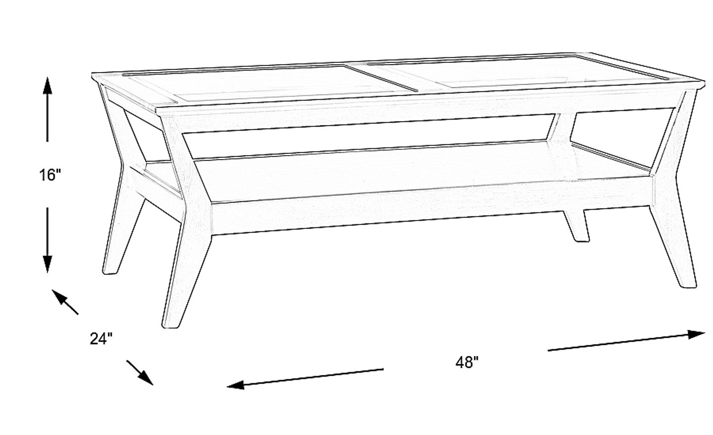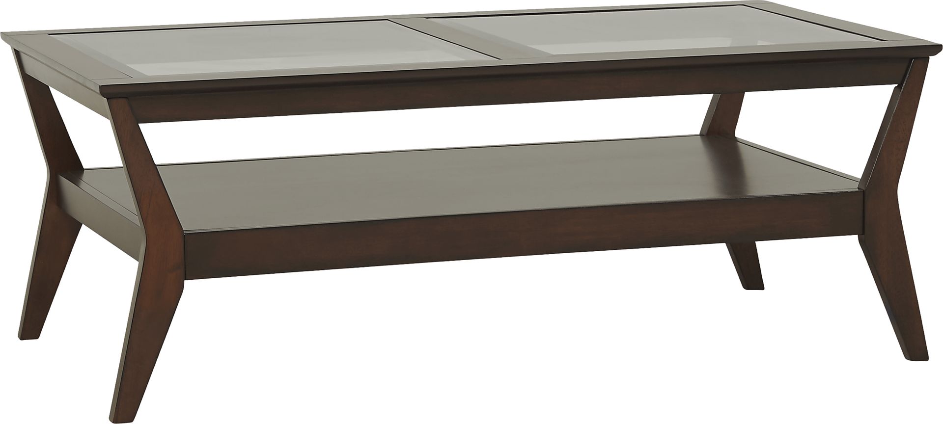 Contemporary style and architectural elements combine to create the eye-catching design on the Mondello cocktail table. Angled lines evoke mid-century styling, while two tempered glass insertsgrace the top. This piece is crafted with wood solids and birch veneers in a rich brown finish. A lower display shelf offers space for magazines, remotes and more.