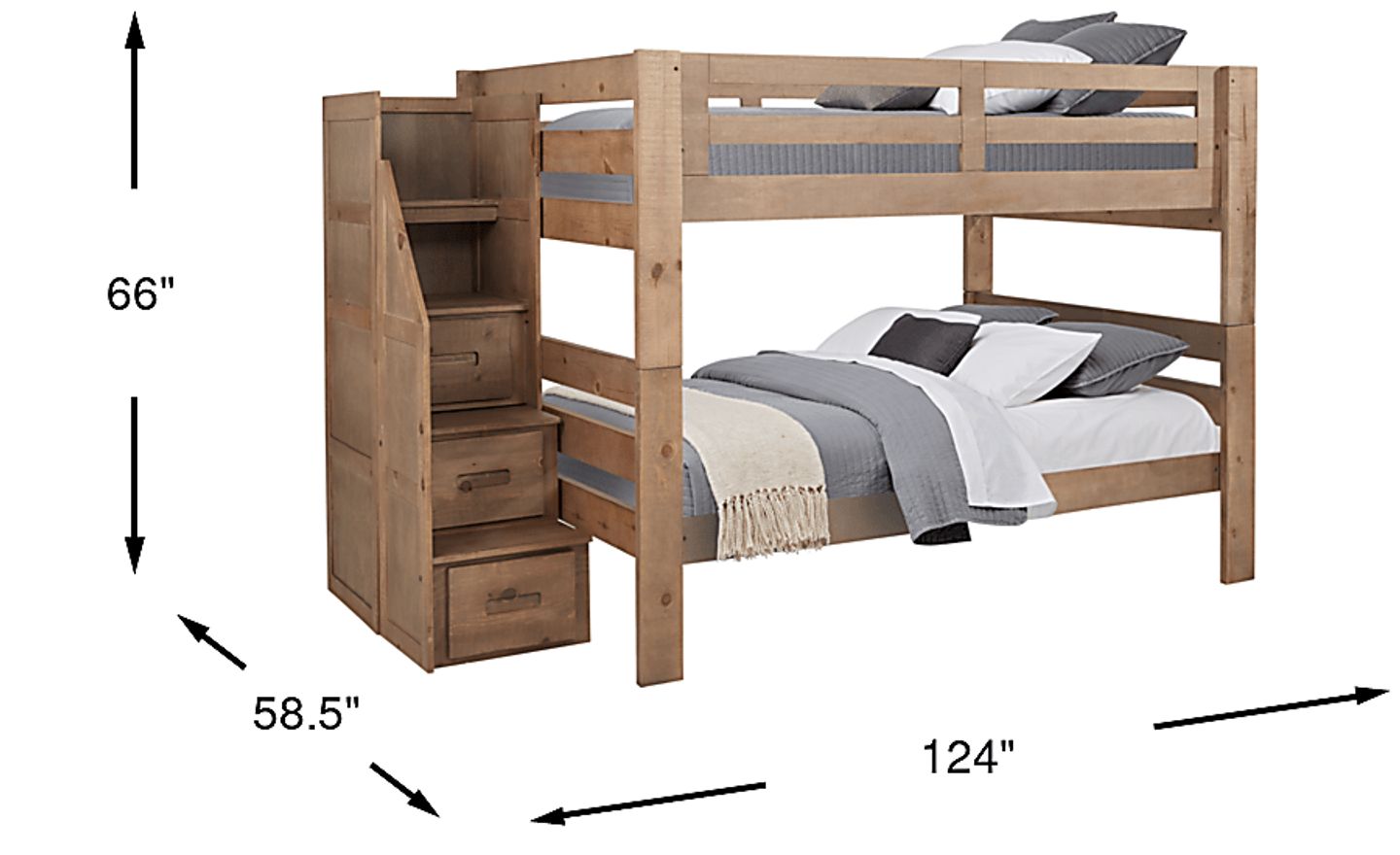 Adaptable enough to meet your child's needs into preteen years and beyond, the rustically styled Montana 2.0 step bunk is an exceptional piece of furniture. Crafted with solid pine and maple veneers, the driftwood finish showcases subtle natural tree rings with distressed details. The steps, which can be placed at either end of the bed, provide built-in storage drawers great for clothes or toys. Trundle sold separately. Mattresses and foundations (if required) sold separately. Bunkie boards required.