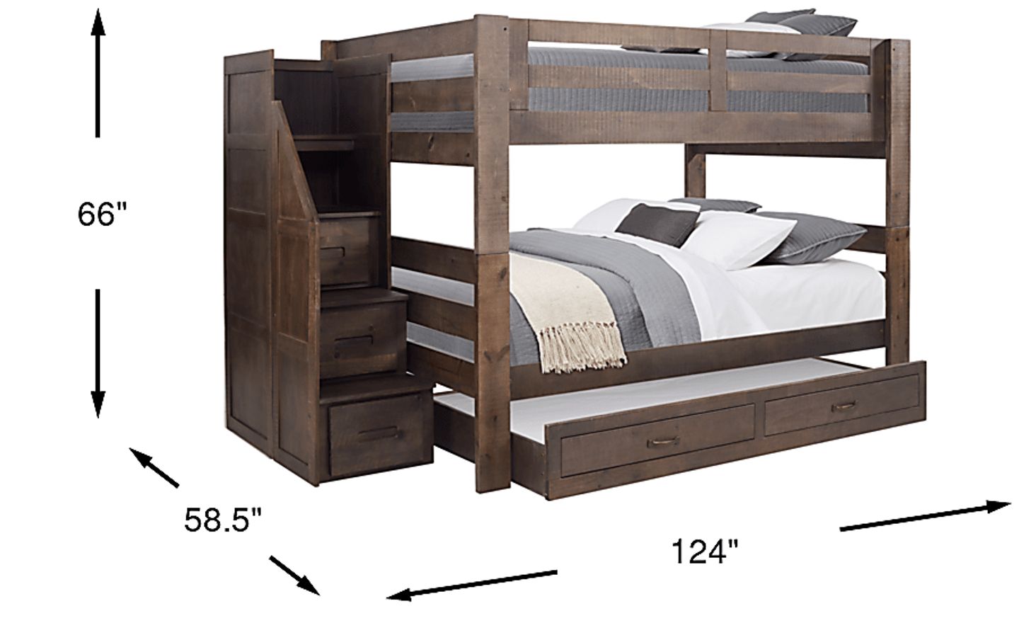 Adaptable enough to meet your child's needs into preteen years and beyond, the rustically styled Montana 2.0 step bunk is an exceptional piece of furniture. Crafted with solid pine and maple veneers, the espresso finish showcases subtle natural tree rings with distressed details. The steps, which can be placed at either end of the bed, provide built-in storage drawers great for clothes or toys. This product requires a bunkie board (sold separately) Mattress and foundation (if required) sold separately. Trundle sold separately.