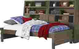 Adaptable enough to meet your child's needs into preteen years and beyond, the rustically styled Montana bookcase daybed is an exceptional piece of furniture. Crafted with solid pine and maple veneers, the espresso finish features subtle natural tree rings and distressed details. A great space-saving solution, double book shelves feature multiple cubbies for storing and displaying books, trophies, or other collectibles. Horizontal panels on the sides add a distinctive minimalist look, perpetuating the clean, stylish versatility of this daybed. Mattress and foundation (if required) sold separately. Bed shown is twin size.