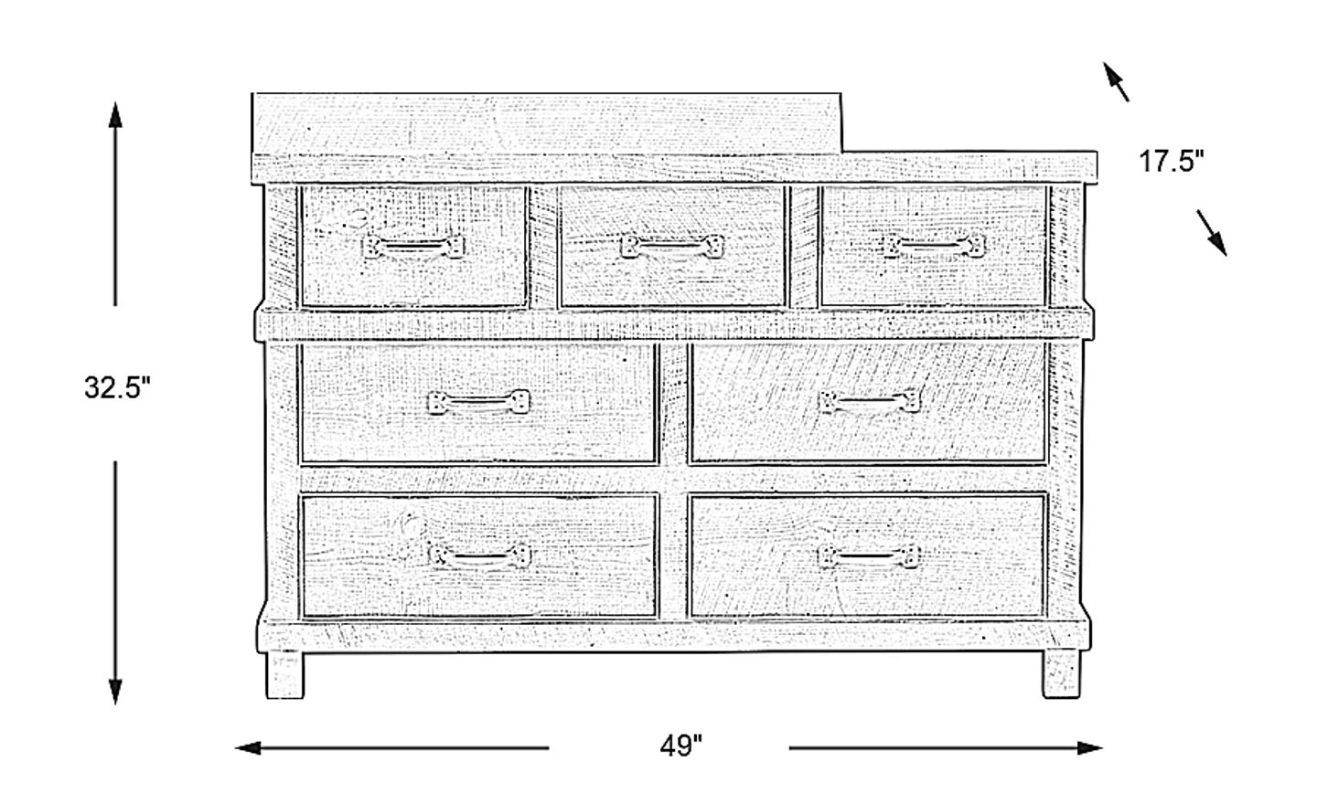 dresser: 49"w x 17.5"d x 32.5"h, tray: 34"w x 17.5"d x 3.5"h, pad: 33"l x 16"w x 4"h