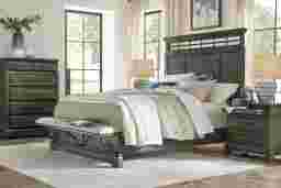 The rustic transitional styling of the Montana Ridge bedroom creates a cozy retreat you will cherish for years to come. Crafted of pine solids and elm veneers, each piece fosters a versatile brown finish with wood grain detailing. The panel bed features a headboard with an open grid-like design at the top. Convenient and chic, a bench built into the footboard is upholstered with soft polyester in a light beige color. Silver finished drawer pulls add a rustic-industrial touch, making this room perfect for apartments, condos and other small spaces. Mattress and foundation (if required) sold separately.