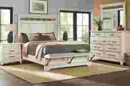 The rustic transitional styling of the Montana Ridge bedroom creates a cozy retreat you will cherish for years to come. Crafted of elm veneers in a versatile white finish, each piece showcases wood-grain-like detailing. The panel bed features a headboard with an open grid-like design at the top. Convenient and chic, a bench built into the footboard is upholstered with soft polyester in a light beige color. Silver finished drawer pulls on the matching nightstand and chest add a rustic-industrial touch, making this room perfect for apartments, condos and other small spaces. Mattress and foundation (if required) sold separately. Bed shown is queen size.