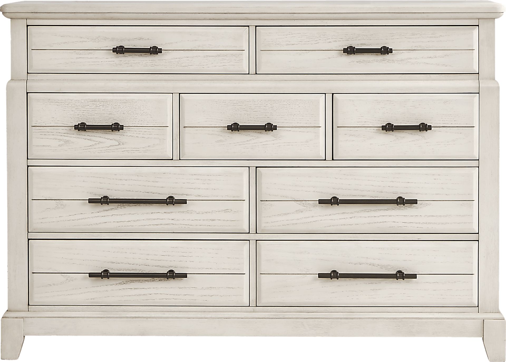 Bring extra space and style to your bedroom with the versatile Montana Ridge dresser. Crafted with elm veneers in a white finish, it showcases an earthy wood grain look. With nine drawers, this dresser offers generous space for stowing away clothes, linens and other personal items. Silver finished drawer pulls grant it a rustic-industrial touch.